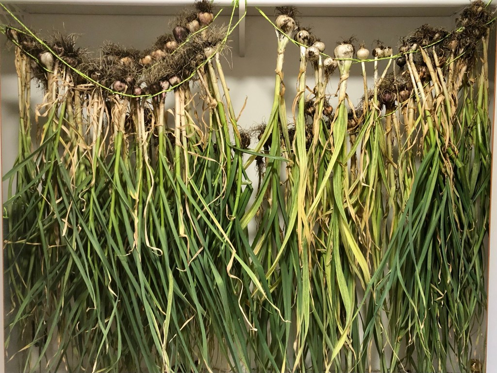 If like me, you have bulbs that are a bit soggy on the outer leaves, don’t cure them, those cloves are still good but have to be used sooner rather than later. The rest of it is hanging up to cure and hopefully will provide full flavour behaviour for the rest of the year. The cure is complete when the green is all dried out and has turned brown. Then you can trim the roots and stems, leaving about one inch of stem at the top of each bulb. To remove any dry dirt, I use a tooth brush, but something similar that won’t damage the skins and is dry would work too. Store them in a cool, dry, dark place (not the fridge), then you can begin enjoying, or share the harvest with friends and family!