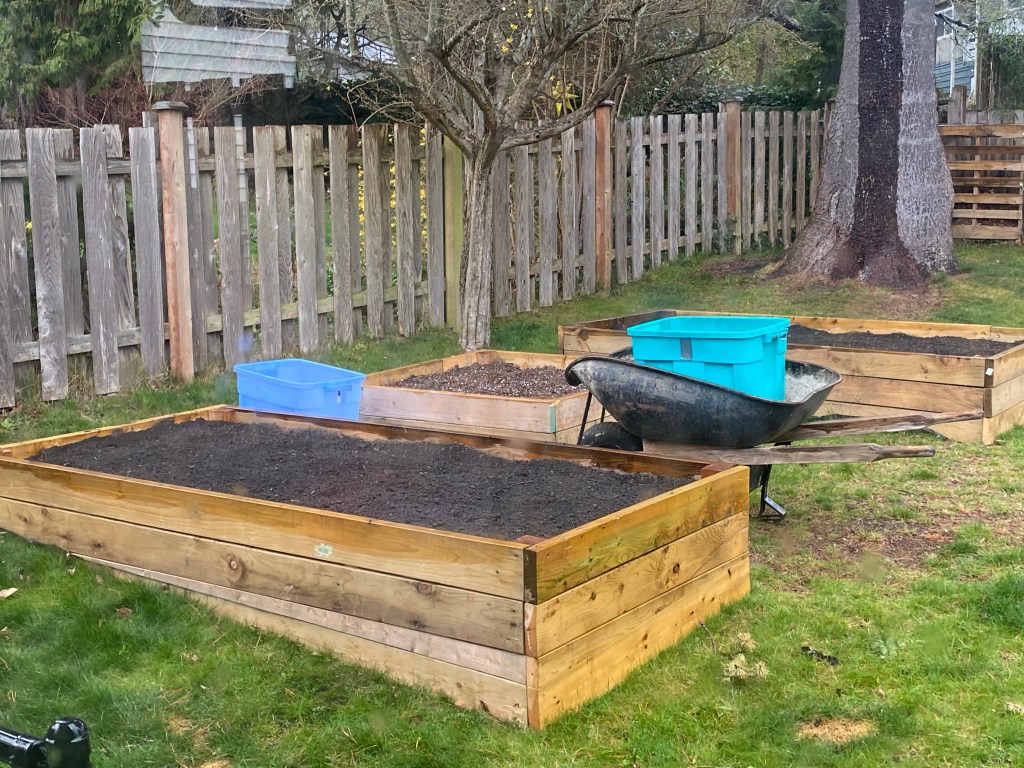 This was a big help in checking my measurements so that I didn’t waste any lumber, and I was able to reclaim most of it from the garden I took down at my old place, and a bed frame I built last summer. The result is level garden boxes which I’m hoping will mean even soil drainage.
