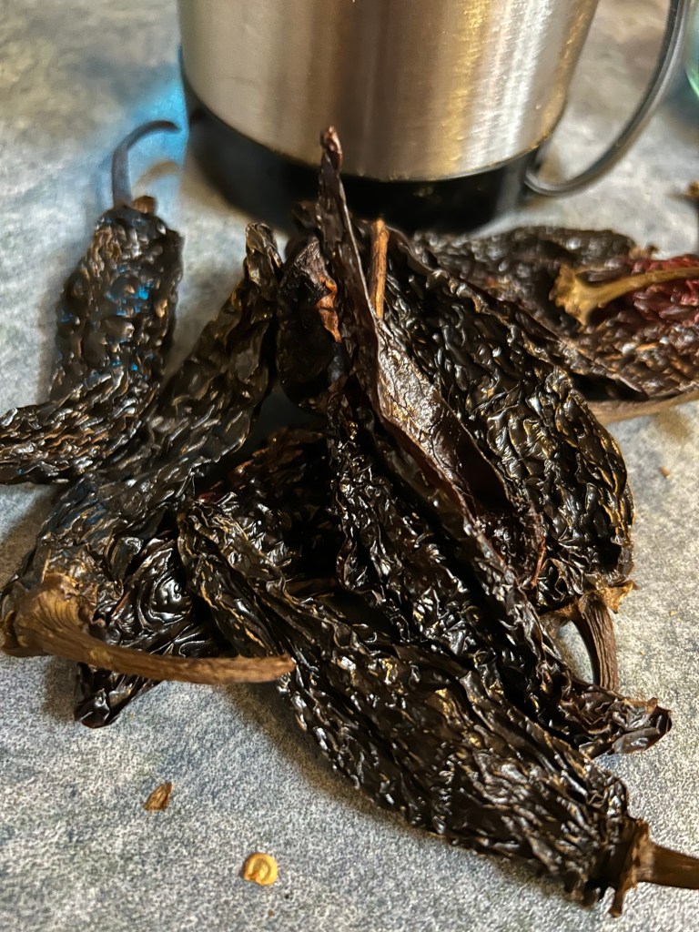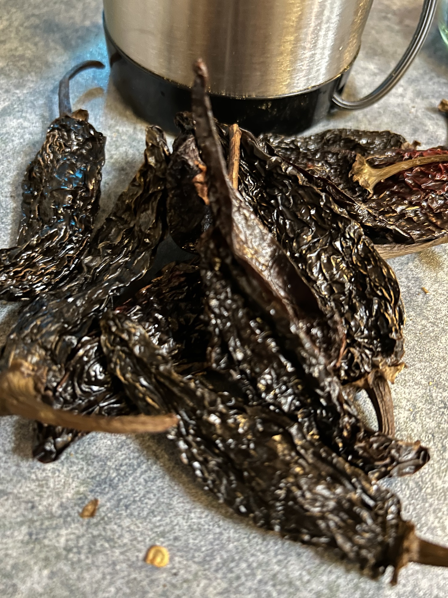 I harvested my plants in early October, and smoked them in the back yard using our big chief smoker and some Alder wood chips. Some people smoke their peppers overnight, but I have not found that to be necessary. Mine smoked for about 4 hours and then went into the dehydrator at 125°F for about 16 hours. The dehydrator time will vary depending on where you live. Start at 10-12 hours and check on them.